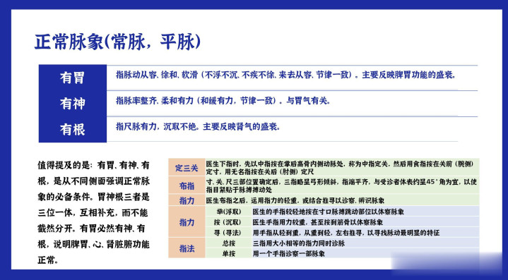 其实对于大多数健康人而言,学习脉诊,刚开始不需要掌握繁杂的二十多种病脉变化,只需牢牢记住“有胃、有神、有根”这三大核心特征即可判断大体的健康状态。“胃、神、根”从不同层面反映人体正气的盛衰、脏腑的协调及生命活动的稳定程度,三者相互联系、不可分割,是认识脉象本质的核心内容。