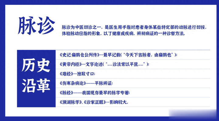 《内经》中把脉诊讲得非常详细,从生理、病理到诊法都提到了。比如说,“脉弱而滑”说明有胃气;肝脉在健康状态下是弦而和缓的,病理状态下则会出现弦脉、弦数脉、弦细脉等不同变化。通过观察不同脏腑在不同季节、不同疾病下的脉象差异,可以理解脏腑功能的变化以及病情的轻重。这就说明,学脉诊不仅是摸脉,更是要理解脉象背后的生理病理意义。